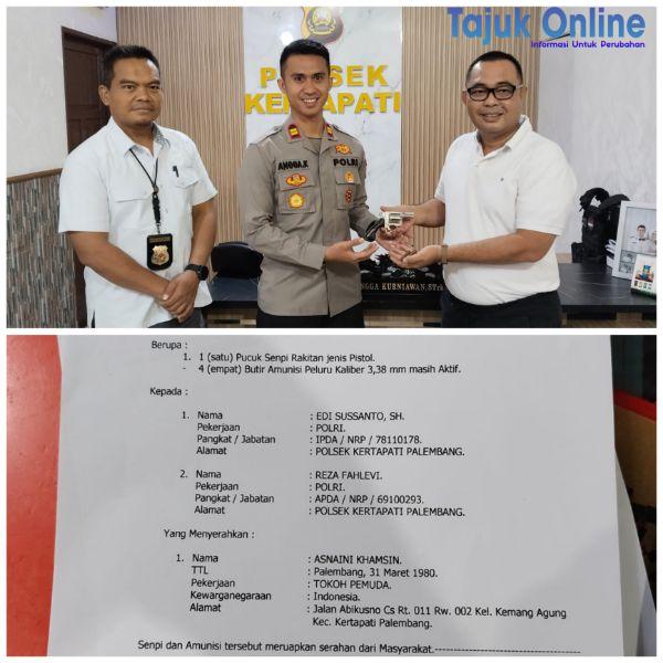 Palembang,Dengan kesadaran atas penting nya menjaga situasi Kamtibmas yang aman dan kondusif,serta kesadaran hukum tentang larangan kepemilikan senjata api rakitan (Senpira),Tokoh pemuda Kertapati dengan sukarela menyerahkan satu pucuk Senpira dan empat butir amunisi Kepada jajaran Polsek kertapati,Selasa(09/07/24)