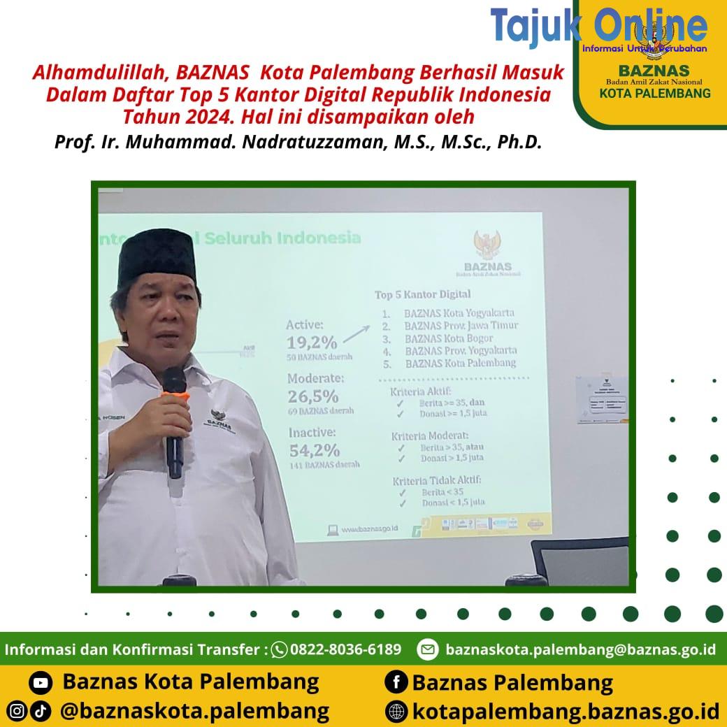 Palembang. BAZNAZ Kota Palembang masuk 5 (lima) besar Kantor Digital BAZNAS untuk kategore kantor digital yang aktif dari sekitar 250 kantor digital BAZNAS se Indonesia dan target kita tahun 2025 sebanyak 400 kantor digital di seluruh Baznas se-Indonesia akan terbentuk,” ujar Pimpinan Baznas Bidang Transformasi Digital Prof. Nadratuzzaman Hosen,Phd. dalam keterangannya di Jakarta, dalam acara Fundraising Development Program pada Jumat