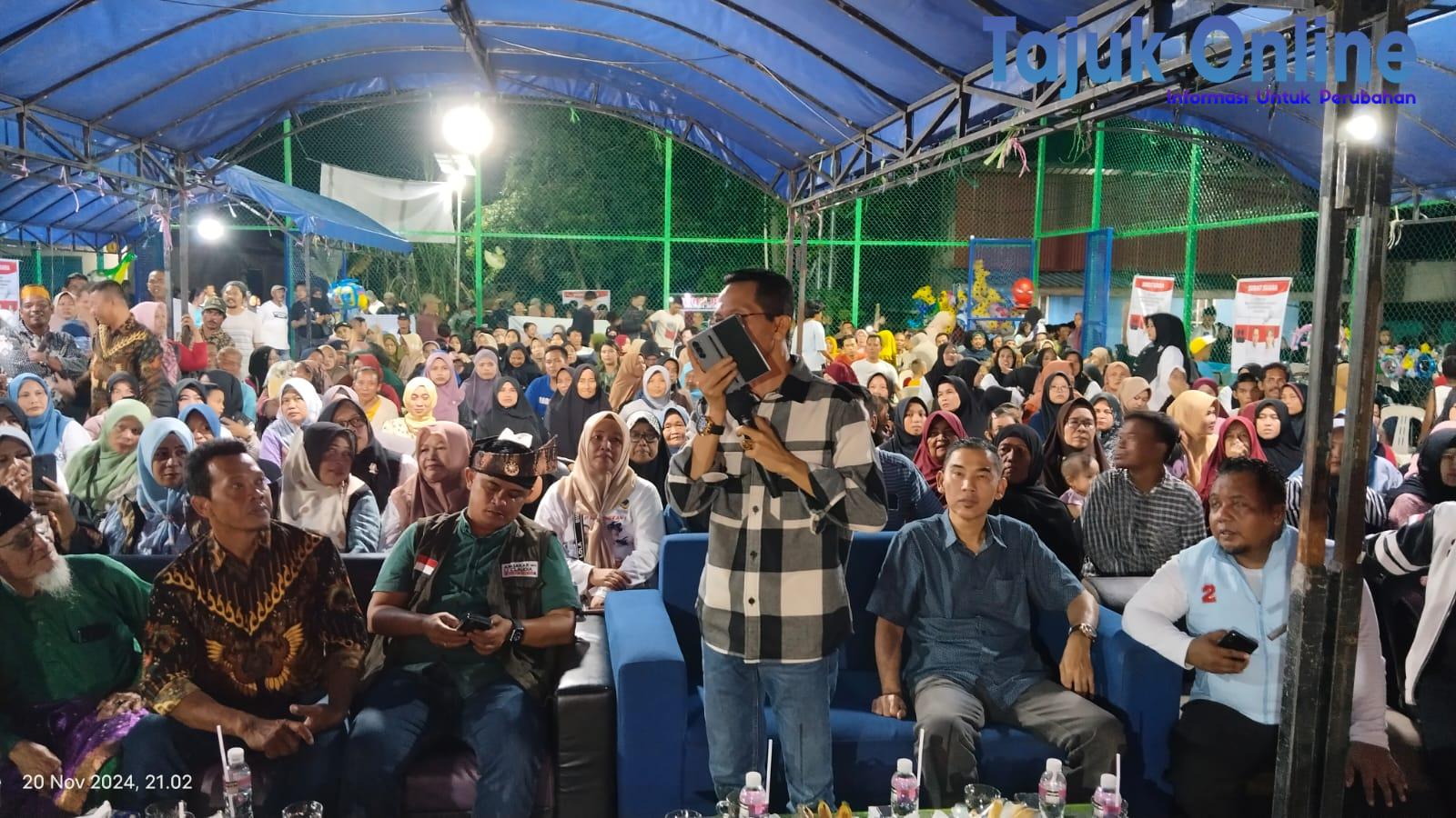 Batam. Kedatangan Pasangan Calon Wali Kota Batam dan Wakil Wali Kota Batam nomor urut 2, Amsakar Achmad dan Li Claudia Chandra, disambut dengan antusias oleh masyarakat Kampung Sukadamai, Kelurahan Tanjungpiayu, Kecamatan Sungaibeduk, Kamis (20/11), malam.