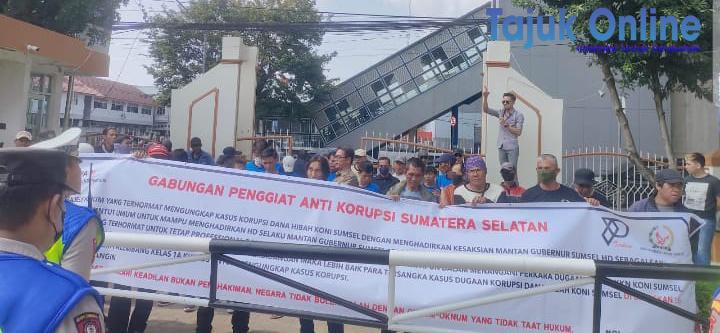 PALEMBANG, Terkait Perkara dugaan tindak pidana korupsi dana hibah KONI Sumsel yang saat ini tengah bergulir di Pengadilan Tindak Pidana Korupsi pada Pengadilan Negeri Palembang Kelas 1A Khusus, lembaga SIRA, BPI KPNPA RI Sumsel dan PST yang tergabung dalam GABUNGAN PENGGIAT ANTI KORUPSI SUMSEL menggelar aksi demonstrasi di Kejati Sumsel Senin 22 Juli 2024.