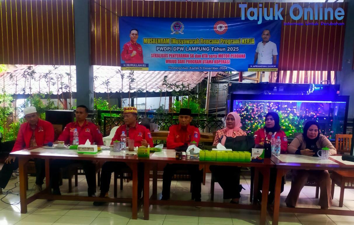 Lampung-Dewan Pimpinan Wilayah Persatuan wartawan Duta pena Indonesia DPW ( PWDPI) Propinsi Lampung Menggelar Musyawarah Rapat kerja daerah yang digelar Di Rumah makan pindang Uwo dibilangan Pramuka Raja basa Bandar lampung kamis (05/12/2024).