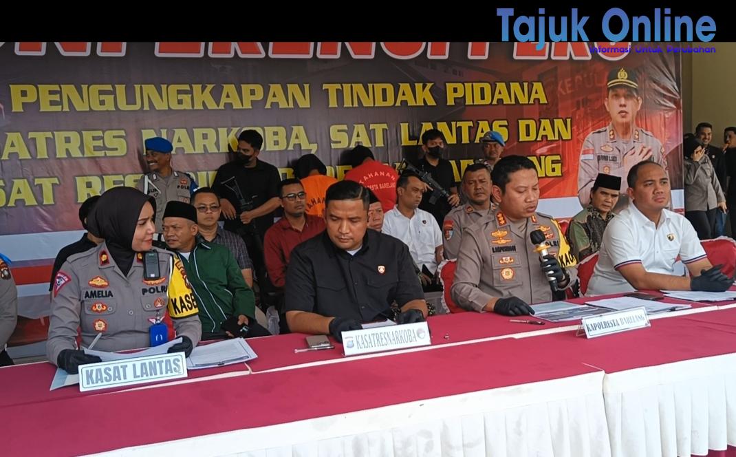 Batam. Polresta Barelang – Kapolresta Barelang Kombes Pol Heribertus Ompusunggu, SIK, MSi gelar konferensi pers ungkap tersangka peredaran gelap Narkotika Jenis Sabu Seberat 4.054,3 Gram dan Ekstasi Sebanyak 900 Butir yang di dampingi oleh Kasat Resnarkoba Polresta Barelang Kompol Satria Nanda, SIK, MH, Kasat Lantas Polresta Barelang Kompol Cut Putri Amelia Sari, S.I.K, Kasat Reskrim Polresta Barelang AKP Giadi Nugraha, S.I.K, Kasihumas Iptu Donald Tambunan, SH, Ketua MUI Kota Batam, NU Kota Batam bertempat di Lobby Mapolresta Barelang. Selasa (16/07/2024)
