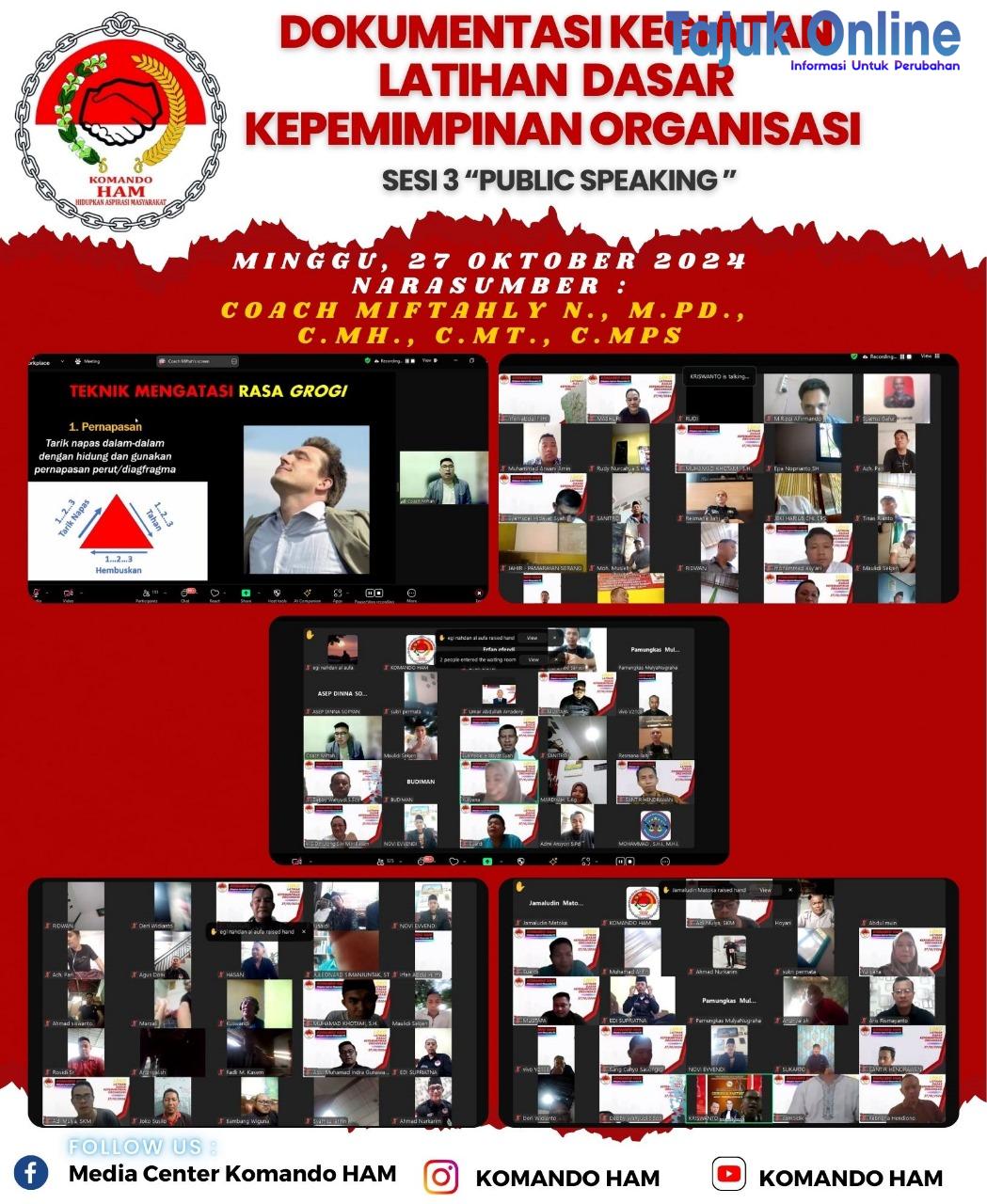 Batam..Dewan Pengurus Pusat Komando Hidupkan Aspirasi Masyarakat (KOMANDO HAM) menggelar Kegiatan Latihan Dasar Kepemimpinan Organisasi (LDKO) yang diselenggarakan secara online melalui via zoom meeting dengan mengusung tema “Meningkatkan Kompetensi Kepemimpinan Yang Berkualitas, Berkarakter, Berdesikasi, Kreatif & Inovatif “ Minggu, 27 Oktober 2024.