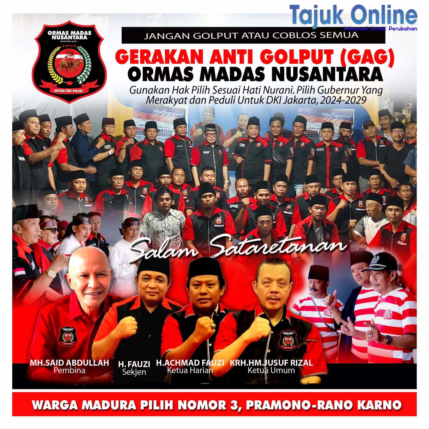 Jakarta — Ormas Madas Nusantara meluncurkan Gerakan Anti Golput (GAG) agar semua masyarakat menggunakan hak pilih di Pilkada DKI Jakarta, 27 November 2024. Pilih Nomor 3, Pramono-Rano untuk kemajuan dan kesejahteraan warga Jakarta.