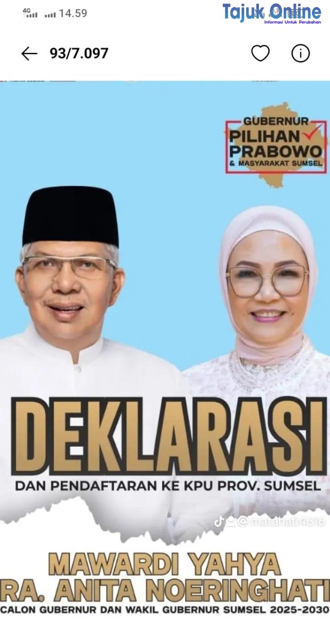 Sumsel. Lebih dari 5 ribu massa mulai dari 11 partai pendukung, relawan, paguyuban, hingga suporter Sriwijaya FC menghadiri deklarasi sekaligus mengantar calon gubernur dan wakil gubernur Sumsel Mawardi Yahya – Anita Noeringhati ke KPU Sumsel.