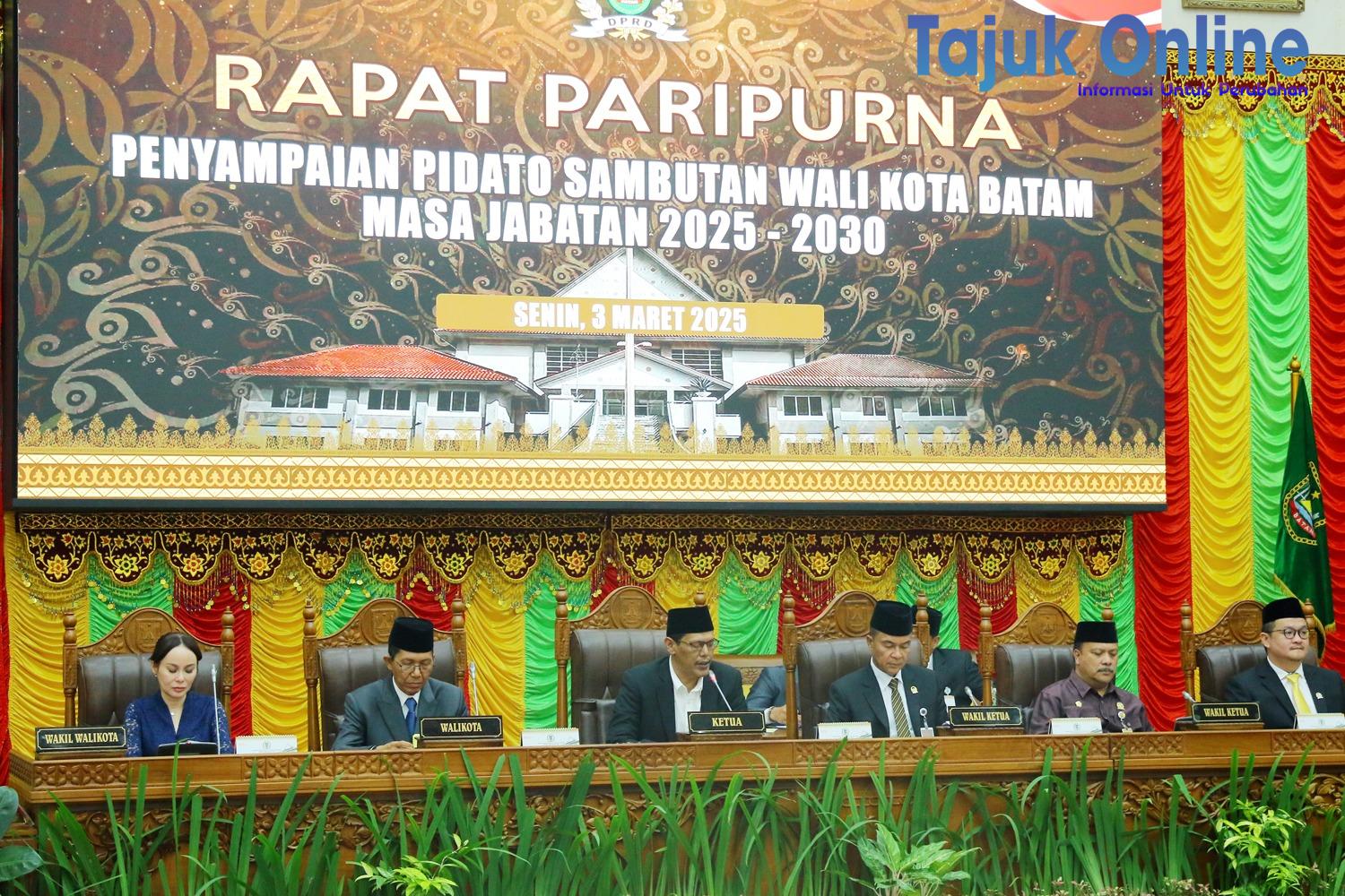 Batam. Wali Kota dan Wakil Wali Kota Batam terpilih periode 2025-2030, Amsakar Achmad dan Li Claudia Chandra, menyampaikan pidato sambutan perdana dalam Rapat Paripurna DPRD Kota Batam, di Ruang Sidang Utama, Senin (3/3/2025). Rapat paripurna dihadiri oleh Forkopimda, Sekretaris Daerah Kota Batam Jefridin, M.Pd., Asisten, serta para Kepala OPD di lingkungan Pemerintah Kota Batam.