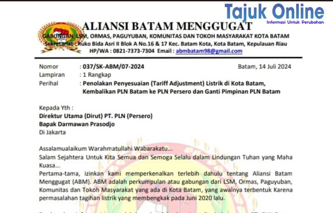 Dalam surat dengan nomor 037/SK-ABM/07-2024 tertanggal 14 Juli 2024 yang diterima oleh redaksi, ABM bukan hanya menyatakan penolakan penyesuaian (Tariff Adjustment) listrik di Kota Batam.