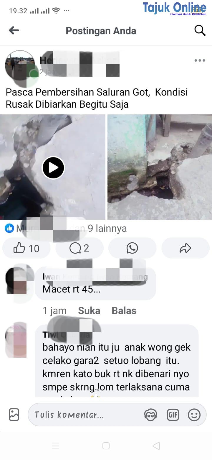 Palembang. Pemberitaan tentang pasca dibersihkan nya saluran got kondisi rusak dibiarkan begitu saja warga khawatir menimbulkan bahaya, ramai di media sosial, hal ini memicu reaksi Netizen yang menyebut bahwa hal tersebut merupakan pakta dilapangan.Jum’at (11/7).